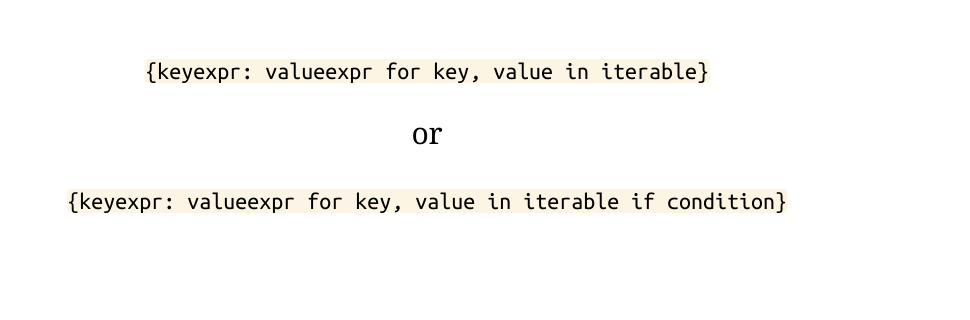 Suppose that we wanted to convert a tuple into a dictionary. With dict comprehension, we can do it in one-line: